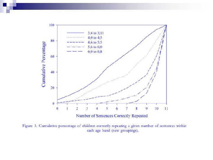 Verbal memory span n Devesovi, A. & Caselli, M. C. 2007. Sentence repetition as a measure of early grammatical development in Italian. International Journal of Language and Communication Disorders, 42, 2 187 -208. Subjects: 100 Italian preschoolers. Method: SR, spontaneous speech, verbal memory span Findings: MLU, articles omission and use of the verbs in the sentence imitation task correlated with the same measures of their free speech. ¨ Positive correlations between verbal memory span and performance of both the imitation task and the free speech. ¨