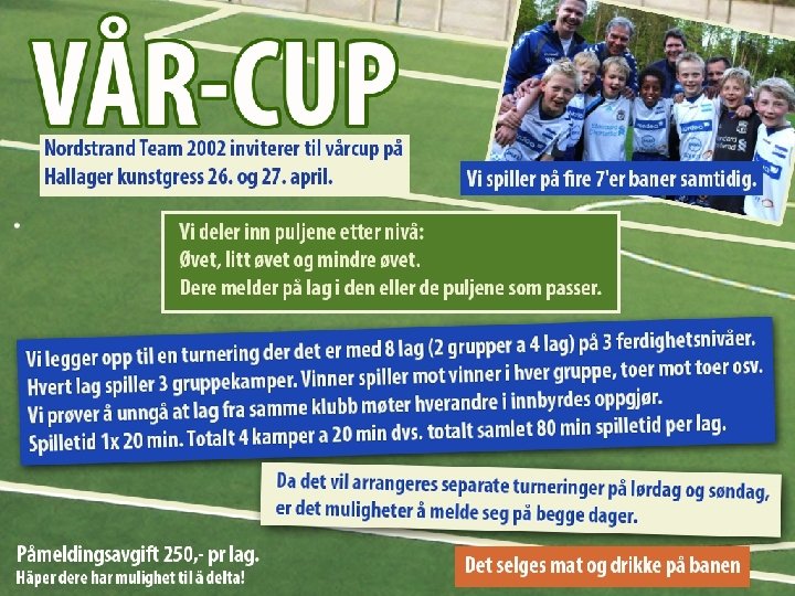 Til foreldrene • Følg med på hjemmesiden til Nordstrand IF og Team 2002, der ligger oppdatert informasjon om trening, kamper etc. – Nordstrand IF: www. nordstrand-if. no – Team 2002: www. nordstrand-if. no/sider/tekst. asp? side=215 • Svar på mail fra lagleder og meld fra seinest 2 dg før kamp dersom sønnen din kan/kan ikke møte til kamp eller cup • Sørg for at sønnen din møter presis til trening og kamper! • Manglende respons på mail som kaller inn sønnen din til kamper, vil medføre mindre spilletid • Manglende treningsoppmøte som ikke er meldt til trenerne vil medføre mindre spilletid