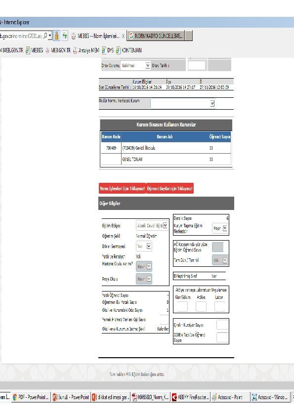 Merkeze Bağlı Taşra Teşkilatı içerisinde yer alan eğitim kurumları, bilim ve sanat merkezleri, halk eğitim merkezleri ve akşam sanat okulları, il/ilçe millî eğitim müdürlükleri, öğretmenevi ve akşam sanat okulu müdürlükleri ile olgunlaşma enstitülerinin, norm kadrolarında değişiklik yapılmaması için veri girişine açılmamıştır. Buna göre; 1 -Eğitim Kurumlarının Norm Kadro güncelleme iş ve işlemlerinde norm kadroya esas bilgilerin e-okul üzerinden alınması yönünde çalışma başlatılmıştır. Söz konusu çalışmaya yönelik; a-Kurum bilgileri veri giriş, b-Norm bilgileri veri giriş, c-Öğrenci bilgileri veri giriş, ekranları oluşturulmuş olup, güncelleme iş ve işlemleri bu ekranlar üzerinden yürütülecektir. İl/ilçe ve eğitim kurumu müdürlükleri tarafından yapılacak iş ve işlemler için (tıklayınız) 2 -Eğitim kurumlarının öğrenci ve şube sayıları e-okul sistemi üzerinden otomatik aktarılacaktır. Bu sebeple; Norm Kadro Modülü güncellemeye açılmadan önce öğrenci ve şube bilgilerinin e-okulda güncellenmesi, 3 -İlkokul, ortaokul, yatılı bölge ortaokulu ve imam hatip ortaokullarının zorunlu ders yükleri sistem tarafından hesaplanacak olup, seçmeli ve yönetici ders yükleri kurum müdürlüklerince girilecektir. Bu sebeple, seçmeli ve yönetici ders yüklerinin sistem açılmadan önce alan bazlı hazırlanması, 4 -Ortaöğretim kurumlarının; yönetici, zorunlu ve seçmeli ders yükleri kurum müdürlüklerince girilecektir. Bu sebeple, yönetici, zorunlu ve seçmeli ders yüklerinin sistem açılmadan önce alan bazlı hazırlanması, 5 -Özel Eğitim kurumları ile bünyesinde özel eğitim sınıfı bulunan eğitim kurumlarının; öğrenci sayısı, şube sayısı ve engel durumuna ilişkin bilgilerin, öğrenci bilgileri veri giriş ekranındaki özel eğitim öğrenci açılımına girilmesi (kaynaştırma öğrencilerinin hiçbir şekilde özel eğitim öğrencisi olarak değerlendirilmemesi ve özel eğitim öğrenci hanelerine girilmemesi), 6 -Talim ve Terbiye Kurulu Başkanlığının 9 sayılı Kurul Kararına göre işlemlerin yapılması (tıklayınız),
