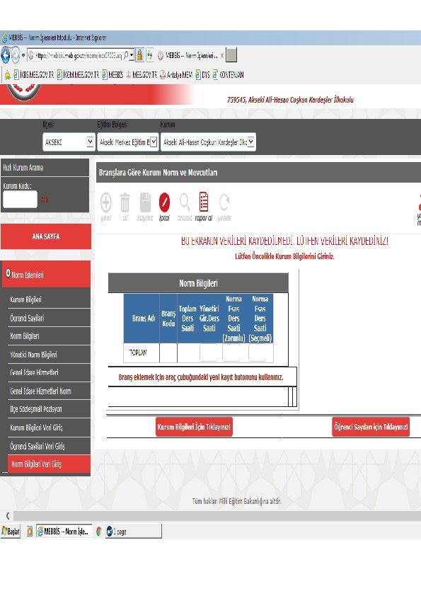 EĞİTİM KURUMU YÖNETİCİLERİNİN NORM KADRO GÜNCELLENMESİNDE YAPMASI GEREKEN İŞ VE İŞLEMLER (Önemli)Veri giriş ekranlarında bilgi girişi yapılabilmesi için Kurum bilgileri veri giriş, Norm bilgileri veri giriş, Öğrenci bilgileri veri giriş, ekranlarında “Kaydet” işlemi yapılmalıdır. Bu işlem yapılmadığı takdirde e-okul ve diğer modüllerden gelen verilerin sisteme aktarımı gerçekleşmeyecektir. 1. KURUM BİLGİLERİ VERİ GİRİŞ EKRANI e-okul üzerinden ; Öğretim şekli, derslik sayısı, yatılı ve pansiyon, birleştirilmiş sınıf bilgileri, yatılı öğrenci sayısı, okul ve kurumdaki oda sayısı verileri aktarılacaktır (Bu verilerde ki hata ve eksikliklerin e-okul ve ilgili modüllerde tam ve doğru şekilde güncellenmesi). Eğitim kurumu müdürlüklerince girilmesi gereken veriler; Tam gün/tam yıl, çırakkursiyer sayısı, 3308’e tabi öğrenci sayısı, A. Ö. kapsamında yüze eğitim öğrenci sayısı, kurum taşıma eğitim merkezi, döner sermaye, hastane okulu bilgileri, alan/bölüm, atölye, laboratuvar sayıları ve aynı binada eğitim veren kurumların ilişkilendirme iş ve işlemlerinin eğitim kurumu müdürlüklerince veri girişinin yapılması. 2. ÖĞRENCİ SAYILARI VERİ GİRİŞ EKRANI e-okul üzerinden; Özel Eğitim Kurumları ile diğer eğitim kurumları bünyesindeki özel alt sınıflar hariç olmak üzere, tüm eğitim kurumlarında ve özel eğitim kurumları ana uygulama sınıflarındaki şube ve öğrenci sayıları aktarılacaktır (Bu verilerde ki hata ve eksikliklerin eokulda tam ve doğru şekilde güncellenmesi). Eğitim kurumu müdürlüklerince girilecek veriler; Özel eğitim kurumları ile özel alt sınıfı bulunan eğitim kurumlarındaki, özel eğitim öğrencilerinin engel durumlarına ait açılımların (Özel Eğitim kurumlarında öğrenci açılımı yapılan sütunlardaki toplam şube ve öğrenci sayıları ile e-okuldaki şube ve öğrenci sayılarının eşit olmaması halinde sistem bilgileri kaydetmeye izin vermeyecektir) girilmesi.