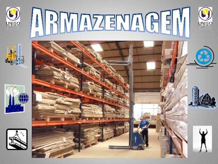 ARMAZENAGEM A armazenagem é considerada a atividade que organiza os produtos em estoque para que os mesmos fiquem à disposição na ocasião em que são solicitados. A armazenagem funciona como um regulador da oferta de produtos por nem sempre coincidir o ciclo de produção com o ciclo de consumo, como no caso de produtos sazonais ou exigência de maturação. Como a armazenagem exige área ocupada e controle, há gastos associados.