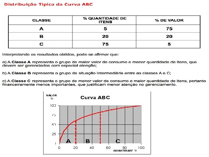 CURVA ABC A curva ABC é um método de classificação de informações, para que se separem os itens de maior importância ou impacto, os quais são normalmente em menor número e divide-se em: