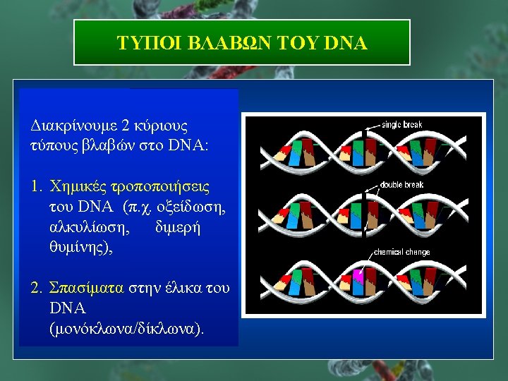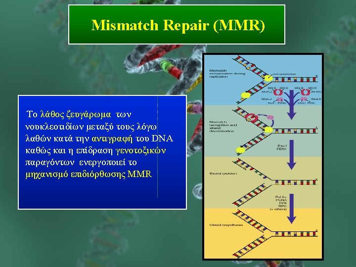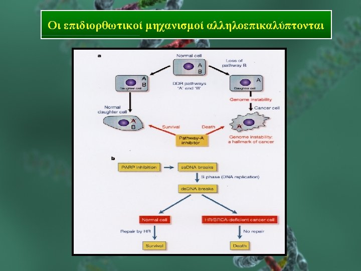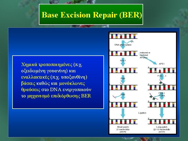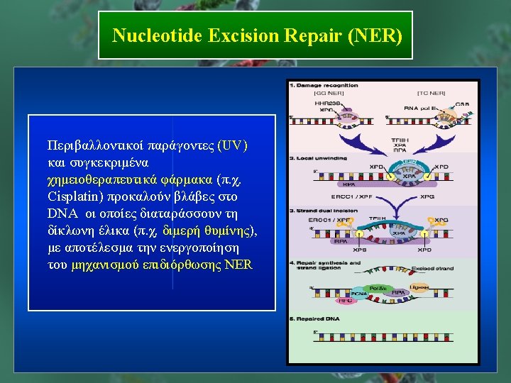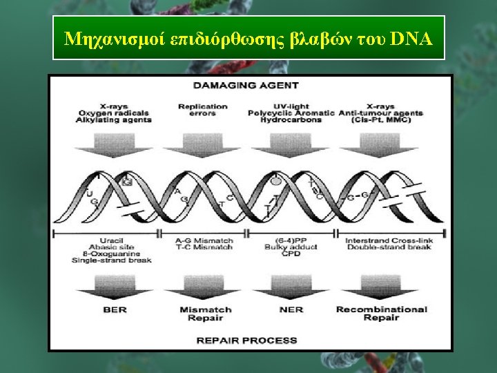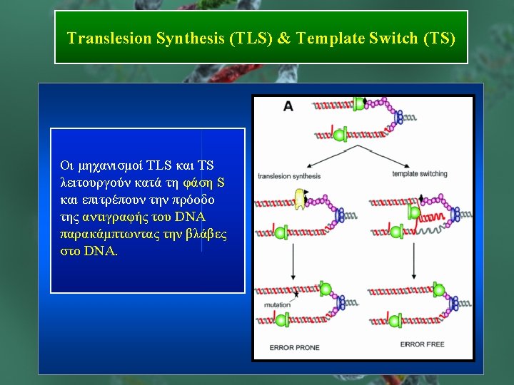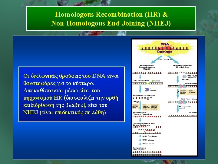 φάσης Πότε λειτουργούν οι μηχανισμοί επιδιόρθωσης βλαβών του DNA; Μηχανισμός/Φάση G 1 S G 2/M NHEJ + + + HR - + + BER + + + NER + + + MMR + + + TSP + TS + NHEJ: Non Homologous End Joining, HR: Homologous Recombination, BER: Base Excision Repair, NER: Nucleotide Excision Repair, MMR: Mismatch Repair, TLS: Translesion Synthesis Polymerases, TS: Template Switch