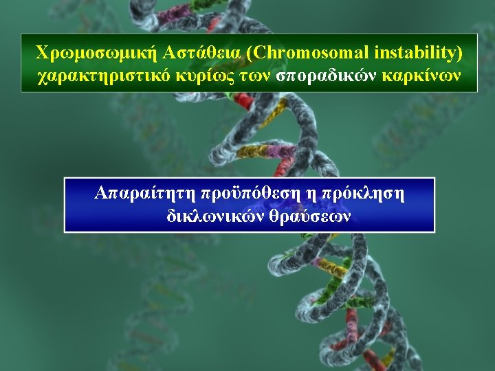 Αναγνώριση της βλάβης της δικλωνικής θραύσης του DNA Genotoxic stress P 53 BP 1 ATM P P ATM 53 BP 1 MRN Complex P γH 2 AX foci