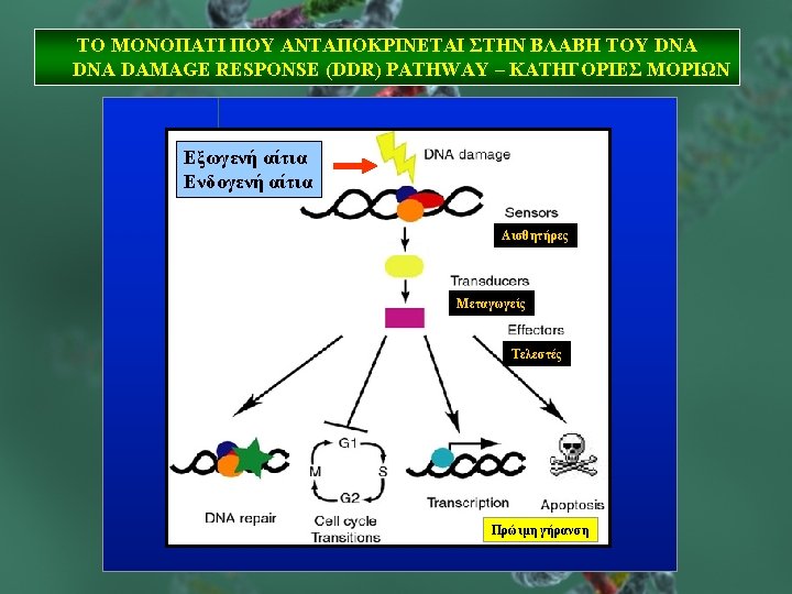 ΕΠΙΚΟΙΝΩΝΙΑ ΤΩΝ ΣΗΜΑΤΟΔΟΤΙΚΩΝ ΜΟΝΟΠΑΤΙΩΝ Ionizing radiation Chemotherapeutics Double strand breaks Replication stress Chemotherapeutics Single strand breaks DNA damage RPARPARPA R ATRIP 9 ad 1 d a R Rfc 2 ATR Hus 1 Rfc 3 Rad 17 Rfc 4 Rfc 5 γ-Η 2ΑΧ Mre 11 Nbs 1 ATM Rad 50 S 317 T 68 Chk 1 Chk 2 P p 53 P P cdc 25 a P S 345 P cdc 25 c Proteolysis P Cyclin A/E P Cdk 2 G 1 arrest P Cyclin B P Cdk 2 p 21 S phase arrest G 2/M arrest