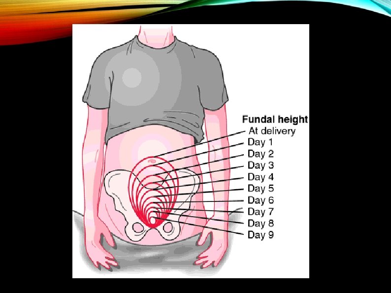 Clinical assessment of Involution of uterus • Fundus lies 13. 5 cm above sypmphysis pubis for the 1 st 24 hrs following delivery • Steady decrease by 0. 5'' in nxt 24 hrs • Day 14 - not palpable- pelvic organ • Completed by 6 wks