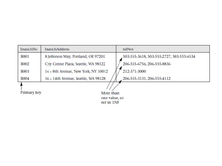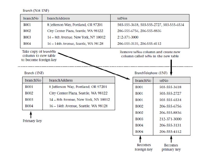 Converting to 1 NF • To convert this version of the Branch table to 1 NF: – create a separate table called Branch. Telephone to hold the telephone numbers of branches, by removing the tel. Nos column from the Branch table along with a copy of the primary key of the Branch table (branch. No). – The primary key for the new Branch. Telephone table is the new tel. No column. • The Branch and Branch. Telephone tables are in 1 NF as there is a single value at the intersection of every column with every record for each table.