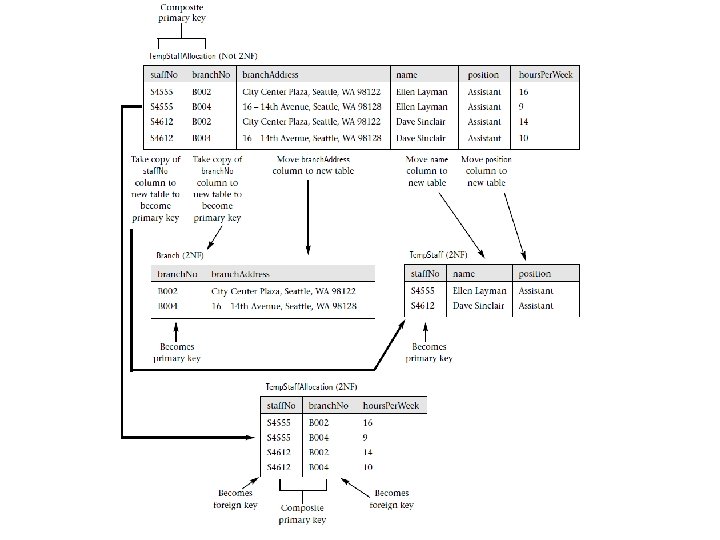 Converting to 2 NF (2) 1. The Branch table is created by removing the branch. Address column from the Temp. Staff. Allocation table along with a copy of the part of the primary key that the column is related to, which in this case is the branch. No column. 2. In a similar way, the Temp. Staff table is created by removing the name and position columns from the Temp. Staff. Allocation table along with a copy of the part of the primary key that the columns are related to, which in this case is the staff. No column.