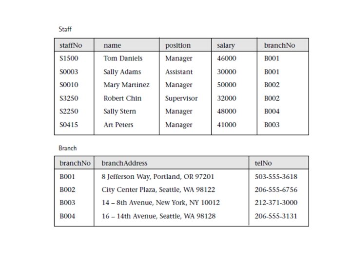 For Example: The structure of these tables is described using a Database Definition Language (DDL): • Staff (staff. No, name, position, salary, branch. No) Primary Key staff. No Foreign Key branch. No references Branch(branch. No) • Branch (branch. No, branch. Address, tel. No) Primary Key branch. No • Staff. Branch (staff. No, name, position, salary, branch. No, branch. Address, tel. No) Primary Key staff. No