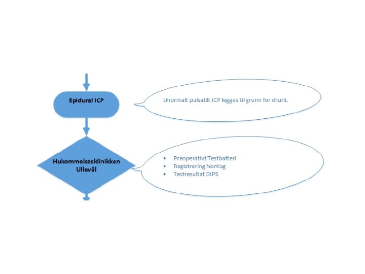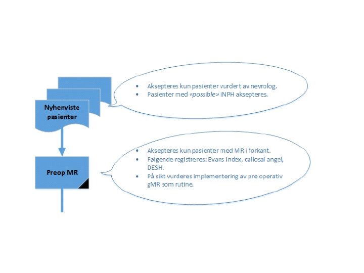 Diagnostiske kriterier for shunt • ”Possible i. NPH” basert på Amerikansk-Europeiske retningslinjer • MR-funn forenlig med i. NPH – Ventrikulomegali med Evans indeks > 0. 3 – DESH-tegn – Callosal-vinkel > 40 grader • Funn ved ICP: MWA > 4 mm. Hg i gjennomsnitt over natt og >5 mm. Hg i minimum 10% av måletiden – MWA = mean ICP wave amplitude (uttrykk for intrakraniell compliance)