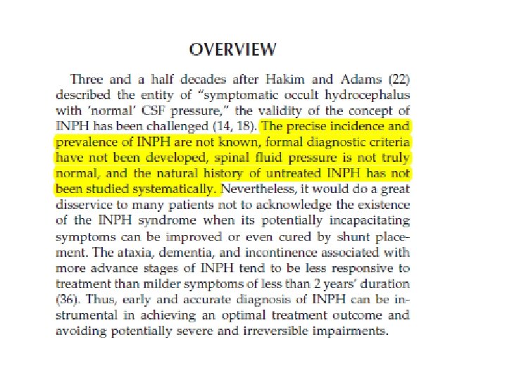 Cerebrovaskulær sykdom • Man mener at i. NPH-pasienter har høyere enn forventet prevalens og grad av periventrikulære hvitsubstansforandringer på MR • Det er økt insidens av vaskulære risikofaktorer blant i. NPH-pasienter • En teori er at kronisk periventrikulær iskemi gir nedsatt compliance i ventrikkelveggen og gradvis ventrikkelforstørrelse som følge av fluktuasjoner i ICP. • En annen teori er at periventrikulær iskemi kan gi lokalt økt venøs motstand og dermed redusert CSFabsorpsjon og ventrikkelforstørrelse