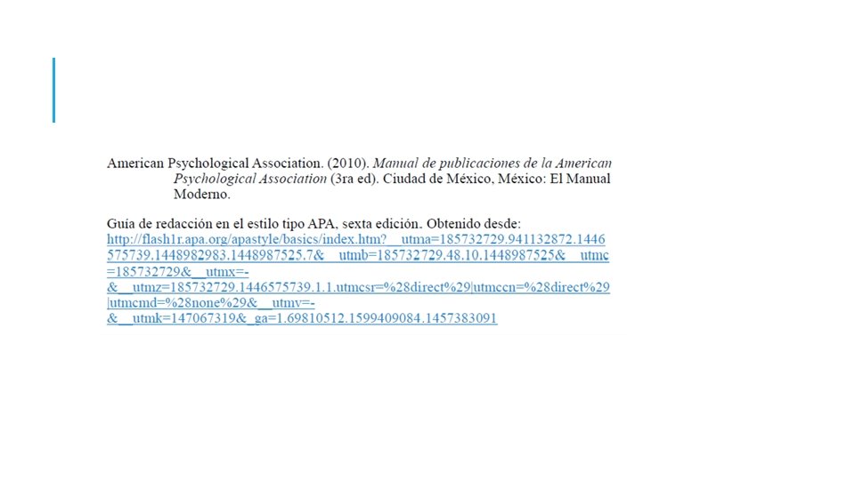 REFERENCIAS VS. BIBLIOGRAFÍA q. Una lista de referencias, cita las fuentes que sustentan la investigación, así como aquellas que se utilizaron para la preparación del trabajo. q. Una bibliografía incluye fuentes que sirven para profundizar en el tema, aunque no se hayan utilizado en el trabajo. q. APA no utiliza BIBLIOGRAFIA, utiliza REFERENCIAS. q. Cada referencia tiene sangría francesa. q. Se ordenan todas las referencias por orden alfabético.