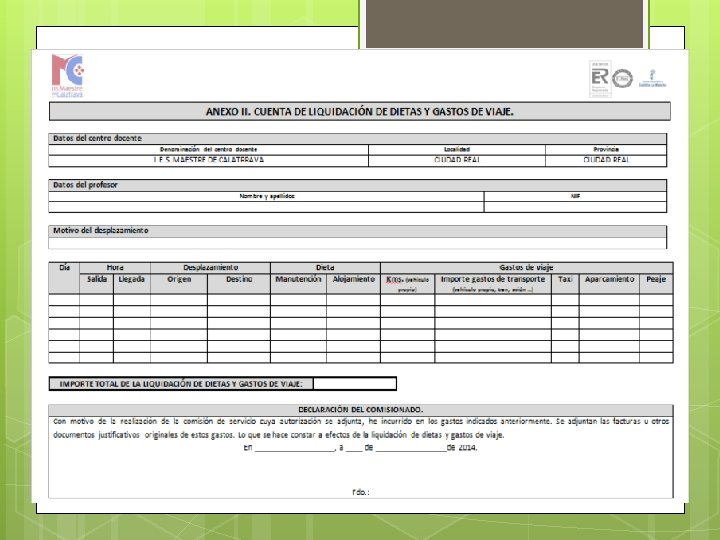 MODIFICACIONES DE NORMA Y PROCEDIMIENTO DE LAS AA. CC. EE. En general, para cualquier actividad: Para la realización de AA. CC. EE. , será necesaria la participación del 70 % del alumnado del curso o cursos implicados, con un mínimo de 20 alumnos, excepcionalmente, se estudiará la posibilidad de realizarse con un número menor de alumnos. - Número máximo de días para: Viajes de estudios entre 2 y 5 días lectivos. Viajes de fin de estudios, máximo 5 días lectivos. Las Dietas del Profesorado estarán sujetas a la normativa vigente: Anexo I. Solicitud de comisión de servicio Anexo II. Cuenta de liquidación de dietas y gastos de viaje (todos los gastos debidamente justificados y con las limitaciones que establece la norma)
