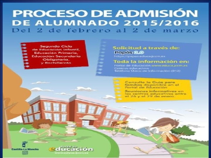 Canales de información Información para las familias: q. Guía para las familias. q. Portal de Educación http: //www. educa. jccm. es q. Centros Educativos. q. Teléfono Único de Información (012). Información para los centros: q. Guía para centros. q. Toledo: admision. to@jccm. es. 925259651 (Sonia); 925259650 (Miguel Ángel); 925805440 (Vicente - Talavera);