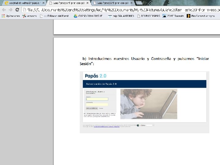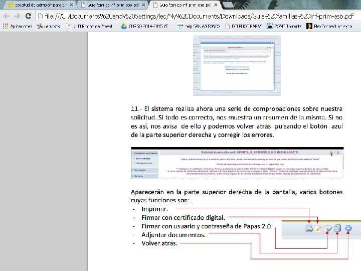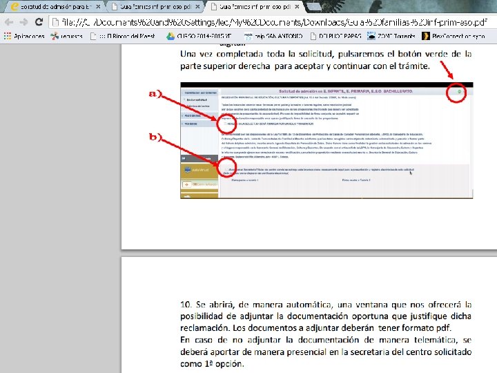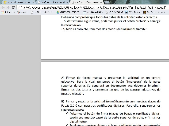 SI NO TENEMOS FIRMA DIGITAL : 1)Firmamos electrónicamente uno de los tutores legales (padres) o el alumno si tiene cumplidos los 18 mediante las claves del Papás 2. 0. En caso de tener que presentar documentación (sólo en “casos especiales”) se adjunta a la solicitud escaneando el documento en formato pdf. RECOMENDABLE PARA LA MAYORÍA DE LOS CASOS, salvo que no se disponga de DNI O NIE (LOS QUE SÓLO TENGAN PASAPORTE HCER LO SIGUIENTE) 2)Imprimimos la solicitud, la firmamos ambos tutores y aportamos la documentación acreditativa que sea necesaria en el propio Centro Educativo. 3)Acudimos a la secretaría de uno de los seis Centros Educativos elegidos, (preferiblemente al de primera opción). Allí nos ayudarán a completar la solicitud a través de Papás.