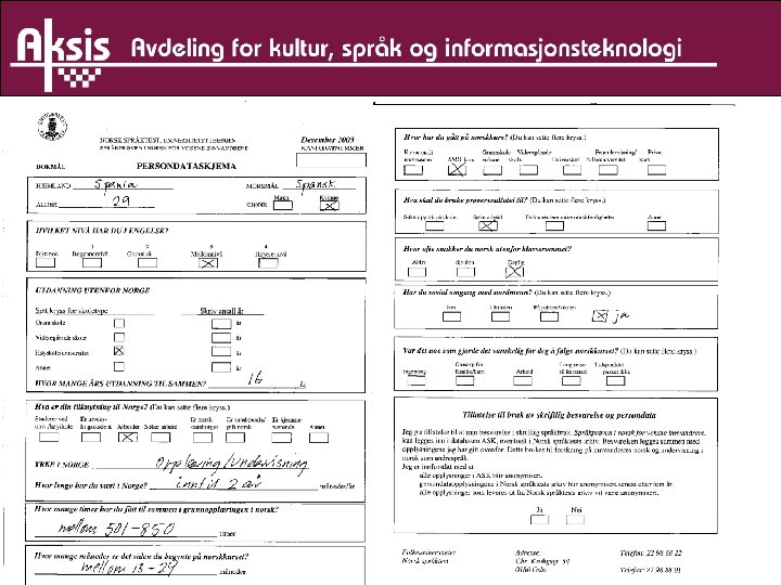 Persondata • • • Skjema har forandret seg gjennom årene Data ligger i SPSS-filer (kodet med kodebok) Ulike formater Eksporteres som tab-separert fil Kobles med tekst gjennom kandidatnummer-år/mnd Diskusjon med Datatilsynet/NSD om hva vi kunne ta med (tekster ble også anonymisert mht. navn, steder etc. )