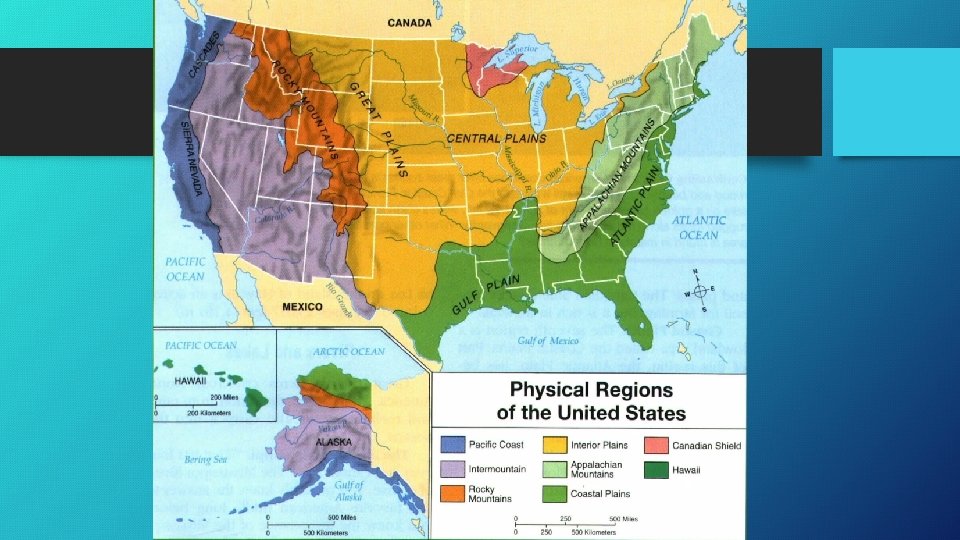 8 Topographical Regions (Contiguous U. S. ) • 1 - The Coastal Plains • 2 - The Piedmont • 3 - The Appalachian Mountains • 4 - The Central Plains • 5 - The Great Plains • 6 - The Rocky Mountains • 7 - The Great Basin • 8 - The Pacific Mountain Ranges …See page 135