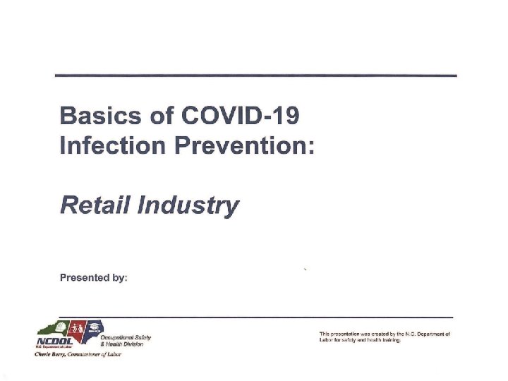 Resources Print Resources • Protect from COVID-19 • You risk being exposed to people with COVID-19 every day. • Encourage essential workers to get a COVID-19 vaccine. PSA’s Videos • General Public: Care for Yourself • Tips to encourage taking care of yourself one small way each day. The COVID-19 pandemic may be stressful for people. Coping with stress in a healthy way will make you, the people you care about, and your community stronger. Social Media Toolkit OSHA website • Note: Existing OSHA regulations may apply to Employers responsibility to protect workers form exposure and infection. • See OSHA's Personal Protective Equipment (PPE) standards (general industry) which require using gloves and eye and face and respiration protection. • See General Duty Clause which requires employers to furnish to each worker "employment and a place of employment, which are free form recognized hazards that are causing or likely to cause death or serious physical harm. EPA website • Reference list of Disinfectants for use against Covid 19 Note: Proper use of disinfectants and precautions • Indoor air/ventilation considerations NCDOL website • Cross references with OSHA, CDC, NC State Updates on current State Executive orders • Powerpoint presentation: Basics of Covid-19, Infection Prevention for Retail Industry • https: //www. labor. nc. gov/ www. cdc. gov