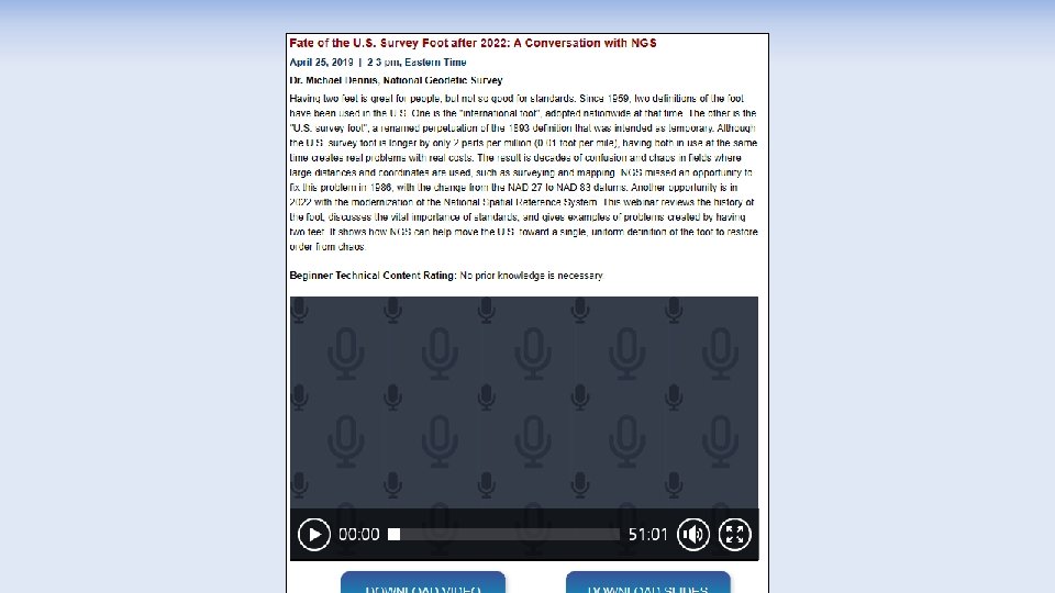 An NGS proposal • Only one foot after 2022 (1 foot = 0. 3048 meter) – Make official through NIST – NO option for U. S. survey foot • NGS will help with the transition – Will fully support backward compatibility – Use “correct” foot for SPCS 83 and SPCS 27 – Automatically done by NGS products and services • Guiding ideas – Best opportunity to make the change – Of all changes in 2022, this is the least significant – Will make things better – About the future, not the past 3