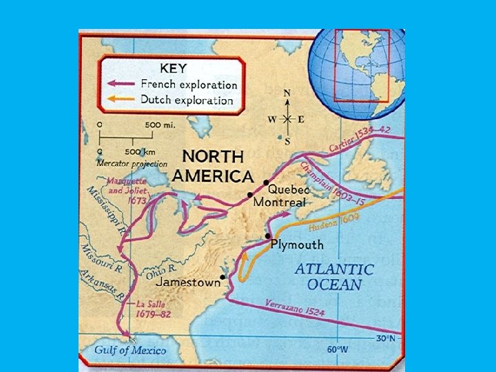 European Colonization • France – Theme: • During the 1500 s, the French colonized northern North America (Canada). • Began early settlements that centered on fur trade – Jacques Cartier • Early Explorer – Samuel de Champlain • Founded Quebec – Robert Cavelier de La Salle • Sailed down the Mississippi River