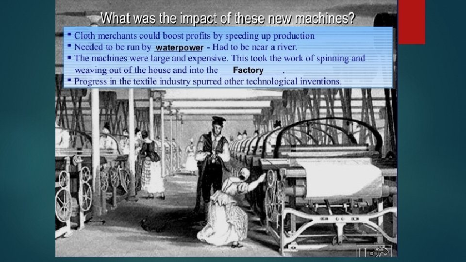 The Industrial Revolution 11. 1 Other inventions sped up the weaving process, so textile mills were built to house the large machines.