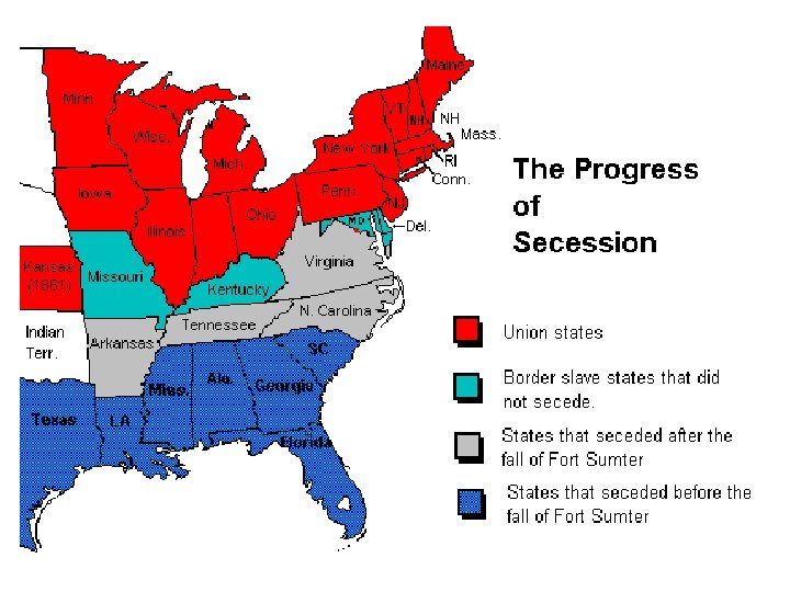 Advantages North • larger population: N= 22 million; S= 9 million • More factories and industries to produce guns, uniforms, and military supplies. • Had control of the Seas , could get oversea supplies. • Northern railroad system twice as large as the South’s to move troops and supplies. • Most of the banks and cash in the U. S. (75% of wealth) South • Great Military Leaders • Most of the war fought in the South on familiar territory. • More skilled horsemen and riflemen. • Fighting for independence. • Did not need a victory, only a defensive strategy