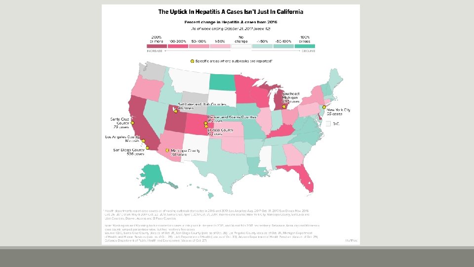 Hepatitis A What is Hepatitis A – Vaccine-preventable communicable disease of the liver Symptoms – fatigue, low appetite, stomach pain, nausea, and jaundice Incubation period – 14 -28 days (period between exposure to infection and the appearance of the first symptoms) How is it spread – Person-to-person through fecal-oral route or consumption of contaminated food or water How long are you sick – 2 months (antibodies last a lifetime once infected) How prominent – estimated 4, 000 cases in U. S. in 2016 (Many states are currently experiencing outbreaks) *information from Center for Disease Control