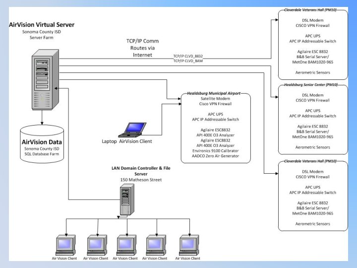 NSCAPCD Monitoring Network • 3 PM 10 Aerometric Sites w/ Met. One BAM 1020 -965’s and Agilaire ESC 8832’s • 1 Ozone Aerometric Site w/ Redundant Teledyne API 400 E Ozone Analyzers and Agilaire ESC 8832’s • 3 DSL Lines w/ CISCO VPN Firewalls • 1 Satellite Link w/ CISCO VPN Firewall • Agilaire Air. Vision© Software on a Virtual Server w/ Separate SQL Database