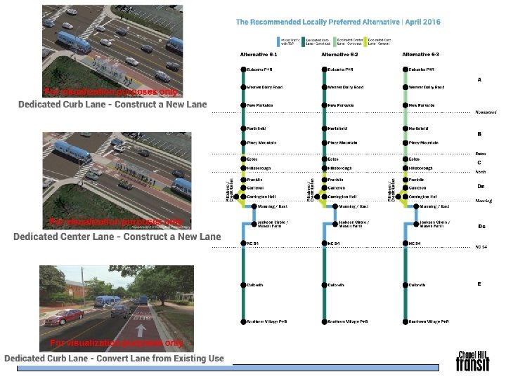 Study Committees Participants North Carolina Department of Transportation Town of Chapel Hill/Chapel Hill Transit Town of Carrboro University of North Carolina at Chapel Hill UNC Health Care Chapel Hill-Carrboro Chamber of Commerce Downtown Partnership Orange County Go. Triangle Chapel Hill Transportation Board Carrboro Transportation Advisory Board Durham-Chapel Hill-Carrboro MPO Similar structure will be used to help guide the next phase of the project
