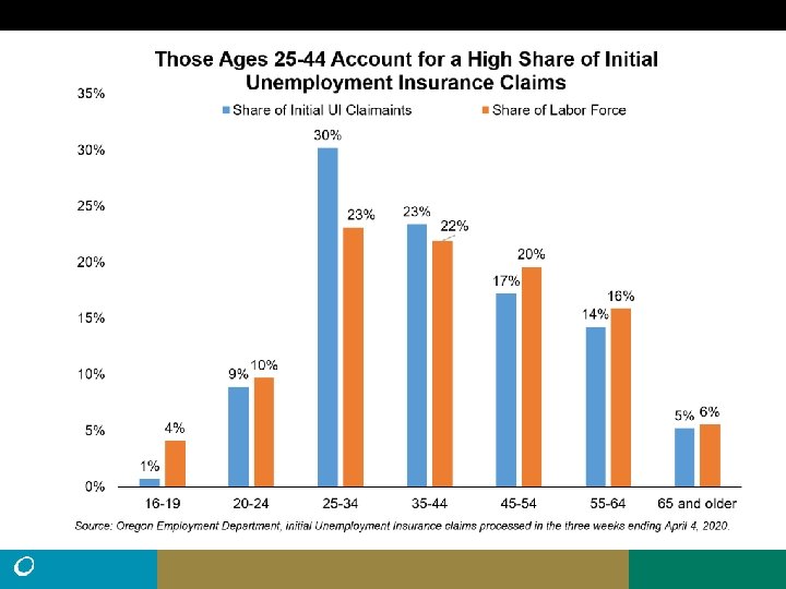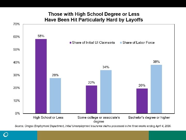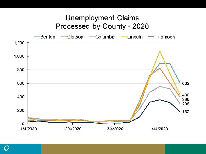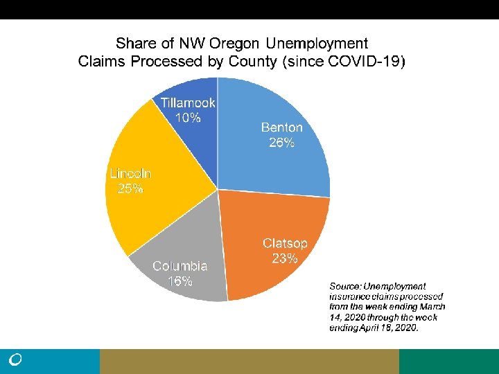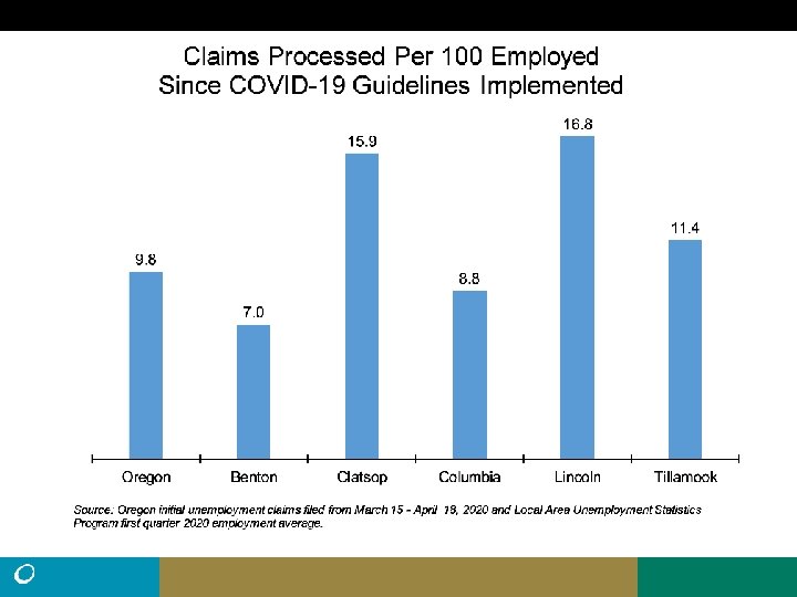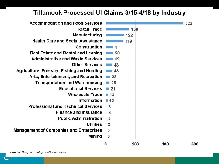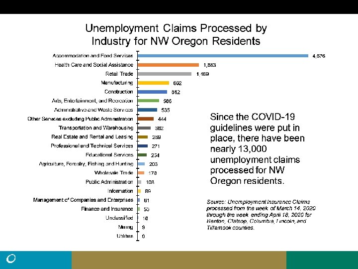 • Northwest Oregon had nearly 13, 000 processed UI claims from March 15 to April 18, greater than the total claims for all of 2019 (10, 204). • Statewide there were 45% more claims filed than processed during that time. It is possible that roughly 18, 500 claims may have been filed from Northwest Oregon. • There were 103, 020 nonfarm payroll jobs in Northwest Oregon in March. Average employment was 119, 669 for Northwest Oregon residents in the first quarter of 2020. • The peak number of unemployed in Northwest Oregon during the Great Recession was 13, 135. (11. 7% Unemployment rate, May, 2009) • Remember: Unemployment claims do not equal unemployment.