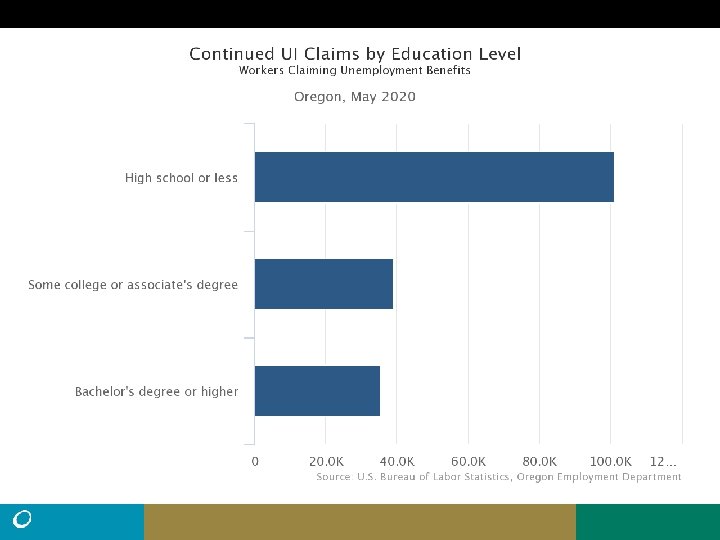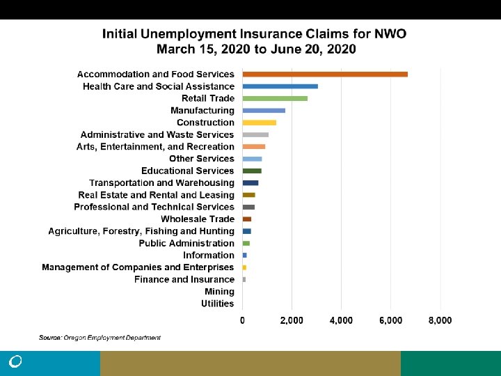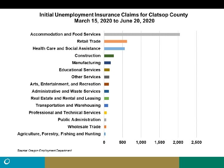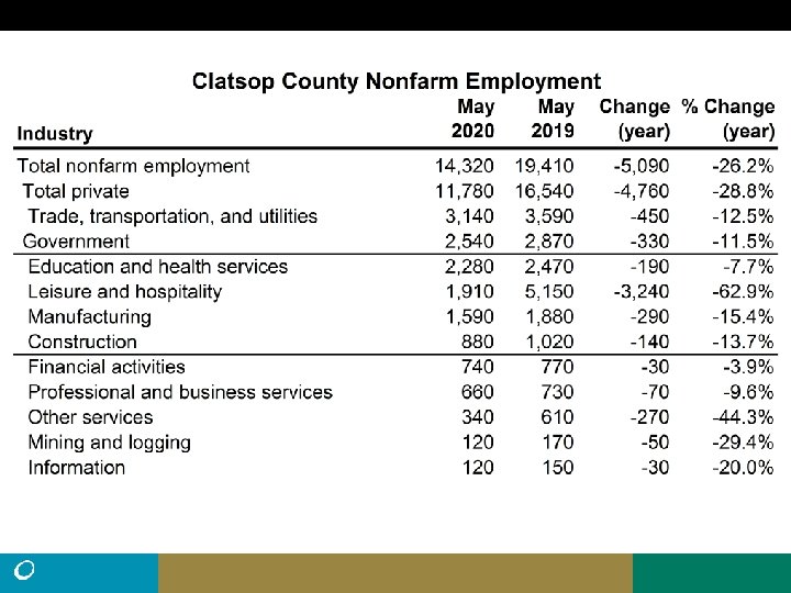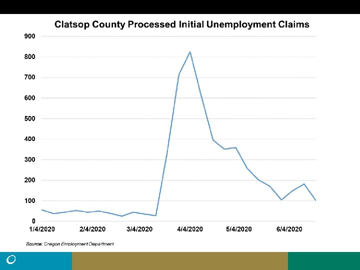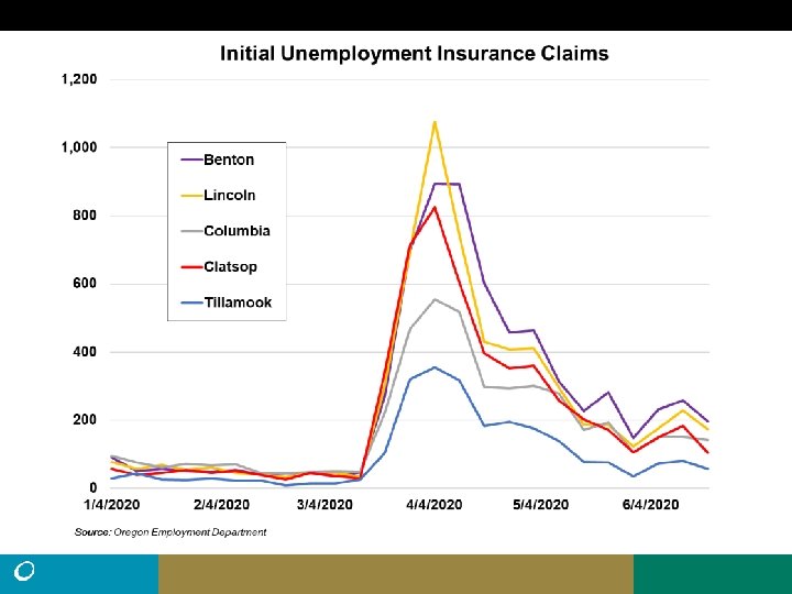 • Northwest Oregon had about 22, 000 processed UI claims (excluding self employed) from March 15 to June 20, more than twice the total claims for all of 2019 (10, 204). • There were 103, 670 (seasonally adjusted) nonfarm payroll jobs in Northwest Oregon in March. That fell by 18, 380 (-18%) in April, then by another 490 jobs in May. (preliminary). • Employment change is uneven. Benton and Tillamook lost jobs in May. Clatsop was unchanged. Columbia added some and Lincoln added 680 jobs. • The peak number of unemployed in Northwest Oregon during the Great Recession was 13, 135. (11. 7% Unemployment rate, May, 2009). Current number of unemployed 46% higher at 19, 156.