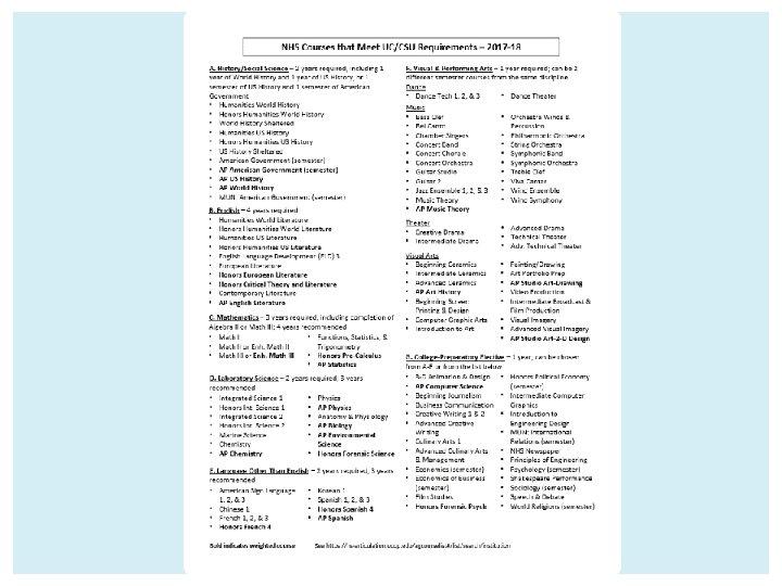 UC/CSU COURSE REQUIREMENTS ALL COURSES MUST BE CP LEVEL A: History/Social Science - 20 credits § 1 year of World History § 1 year of US History OR 1 semester of US History + 1 semester of Government B: English - 40 credits C: Math - 30 credits (40 credits strongly recommended) § Must complete Algebra II or Math III D: Laboratory Science - 20 credits (30 credits strongly recommended) § UC: Must include 2 from Biology, Chemistry, and Physics § CSU: Must include 1 Biological and 1 Physical science E: Language Other Than English - 20 credits (30 credits recommended) F: Visual and Performing Arts - 10 credits G: College Preparatory Elective - 10 credits How does the NHS Core Curriculum fit with these requirements?