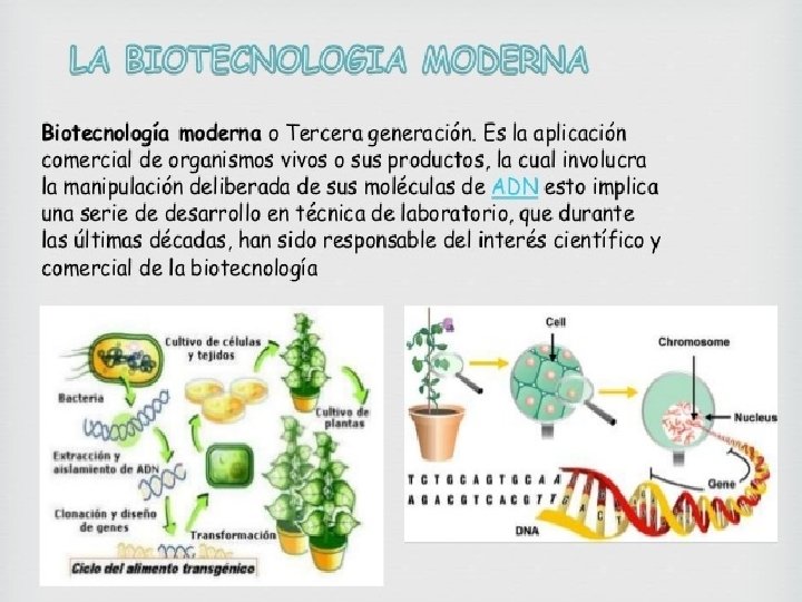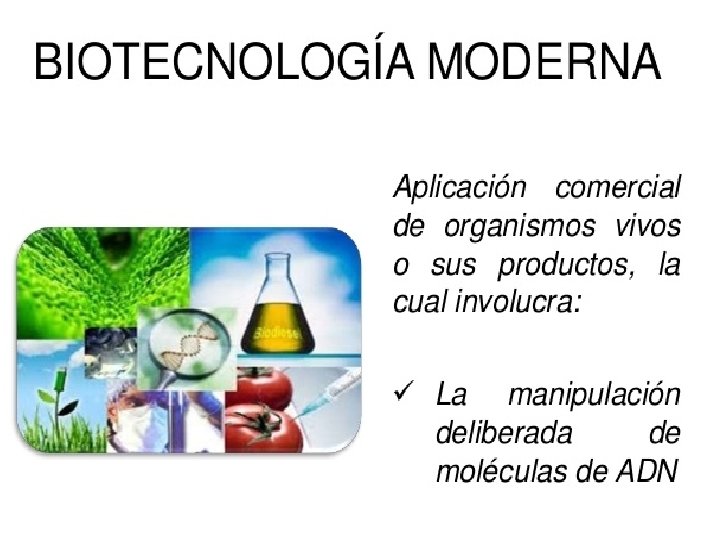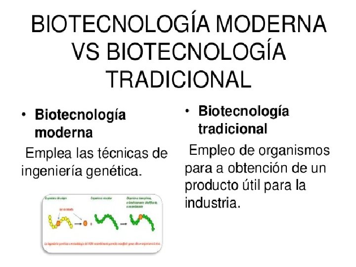 ¿Cuál es la diferencia entre la biotecnología tradicional y la biotecnología moderna? La biotecnología tradicional es la utilización de organismos vivos para la producción de un bien o servicio. La fermentación de las uvas para la obtención del vino y la elaboración de la chicha mediante la fermentación de las semillas del maíz son procesos en los que intervienen microrganismos que transforman los componentes de la uva o las semillas del maíz en alcohol La elaboración del pan con el uso de lavaduras, y del queso y yogurt mediante el agregado de bacterias, son ejemplos de procesos biotecnológicos que se aplican desde la antigüedad, cuando el hombre aún no sabía de la existencia de microorganismos. A diferencia de la biotecnología tradicional, la biotecnología moderna utiliza técnicas, que en su conjunto se denomina ingeniería genética, para modificar y transferir los genes de un organismo a otro. Los científicos saben cómo ocurren los procesos biológicos que les han permitido desarrollar nuevas técnicas a fin de modificar o imitar algunos de ellos y lograr una variedad más amplia de productos.