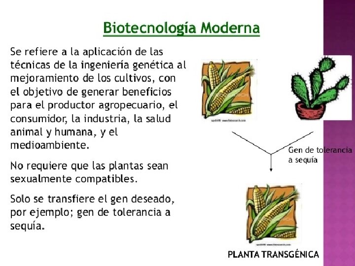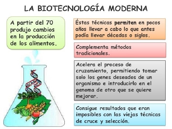 La biotecnología moderna permite la producción de insulina humana en bacterias para mejorar el tratamiento de la diabetes. Mediante la ingeniería genética se transfiere un gen proveniente de una bacteria a una planta, por ejemplo, para la obtención de maíz BT, desarrollado en el recurso anterior. ¿En qué se diferencian las técnicas de la biotecnología tradicional y de la biotecnología moderna? El siguiente esquema muestra las características de las técnicas de la biotecnología tradicional y de la biotecnología moderna empleadas en la obtención de nuevos cultivos.