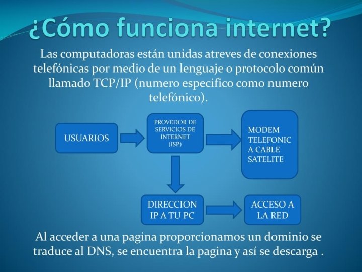 Te invitamos a considerar por qué el servicio de internet es tan difundido en el mundo y la manera de identificar un usuario entre millones. ¿Cómo? Con lo que ya conoces o con la información que te presentamos en páginas 1 y 2 del “Recurso 1: Descubrimos cómo funciona la gran red de internet” (disponible en la sección “Recursos” de esta plataforma). Reflexiona a partir de las siguientes preguntas orientadoras: ¿Cómo funciona internet? Todos los ordenadores conectados en internet tienen que utilizar el mismo protocolo o normas para comunicarse entre ellos, en caso contrario no podrían comunicarse e intercambiar información. . Para conectarnos se hace por medio de un ISP (proveedor de acceso a internet).