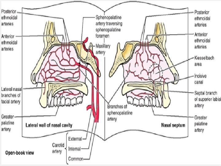 Blood Supply of Nose- Arterial The arterial supply of the medial and lateral walls of the nasal cavity is from five sources: Anterior ethmoidal artery (from the ophthalmic artery). Posterior ethmoidal artery (from the ophthalmic artery). Sphenopalatine artery (from the maxillary artery). Greater palatine artery (from the maxillary artery). Septal branch of the superior labial artery (from the facial artery). �The first three arteries divide into lateral and medial (septal) branches. �The greater palatine artery reaches the septum via the incisive canal through the anterior hard palate. The anterior part of the nasal septum is the site (Kiesselbach area) of an anastomotic arterial plexus involving all five arteries supplying the septum. The external nose also receives blood from first and fifth arteries listed above plus nasal branches of the infraorbital artery and the lateral nasal branches of the facial artery.