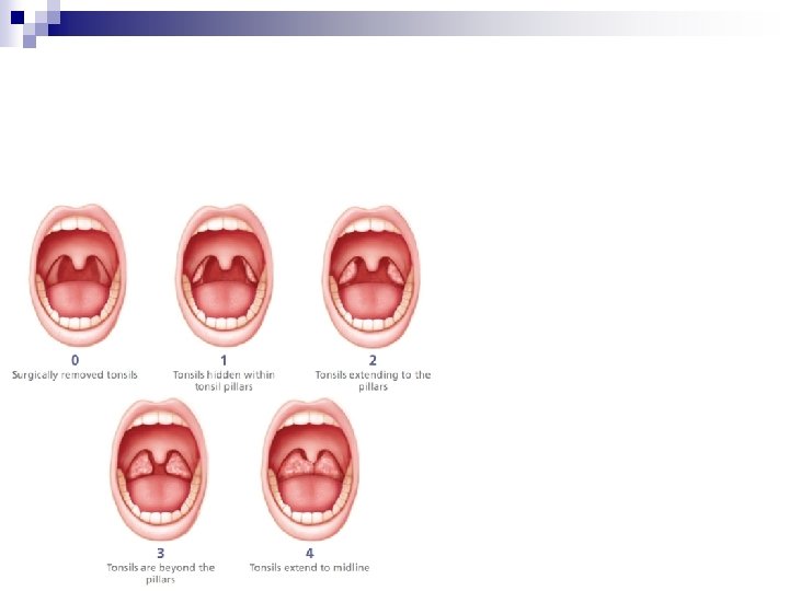 n - Inspect the tonsils. Tonsils may be present or absent. They are normally pink and symmetric and may be enlarged to 1+ in healthy clients No exudate, swelling, or lesions Tonsils are red, enlarged (to 2+, 3+, or 4+), and covered with exudate in tonsillitis.