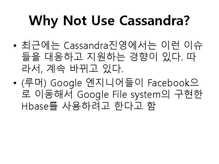 Why Not Use Cassandra? • Different consistency levels carry different risks – using a consistency level of Consistency. Level. ALL would require every replica to respond before the write returns to the client as successful. • Eventual consistency model is not good match for new real-time message platform – found Cassandra’s eventual consistency model to be a difficult pattern to reconcile for our new Messages infrastructure • Poor designed partition schema – Range scan issue – hot spot problem http: //ria 101. wordpress. com/2010/02/22/cassandra-randompartitioner-vs-orderpreservingpartitioner/ http: //facility 9. com/2010/11/18/facebook-messaging-hbase-comes-of-age http: //www. facebook. com/notes/facebook-engineering/the-underlying-technology-of-messages/454991608919