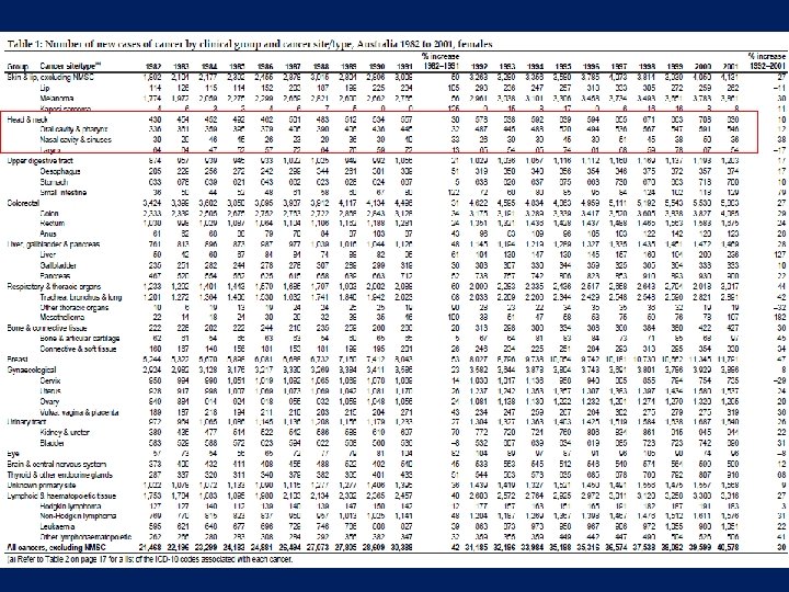 INCIDENCE AND MORTALITY IN AUSTRALIA - 2006 2, 756 new cases (2. 6 per cent of all new cancer cases). Most common in males= 2, 059 than females = 697. The lifetime risk of developing a head or neck cancer before the age of 75 is 1 in 95 The most common forms of head and neck cancers in 2003* were: o Larynx (557 cases; 498 male, 59 female) o Tongue (492 cases; 343 male, 149 female) o Mouth (466 cases; 287 male, 179 female). In 2007, head and neck cancers were responsible for 898 deaths in Australia, accounting for 2. 3 per cent of all cancer deaths