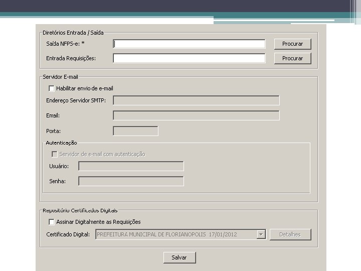 Utilização do Cliente NFPS-e Configurações do Sistema • Diretórios ▫ Exportação de NFPS-e (armazenamento de NFPS-e) ▫ Importação de Requisições de NFPS-e (integração com ERP) • Servidor de E-mails ▫ Envio de e-mail automático aos tomadores �Envio de Requisição de NFPS-e �Cancelamento/Substituição de NFPS-e • Certificado Digital ▫ Assinatura das requisições enviadas à prefeitura