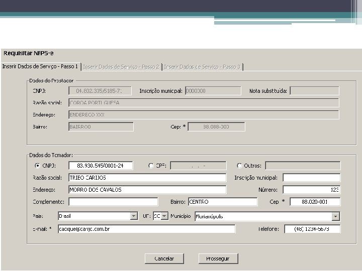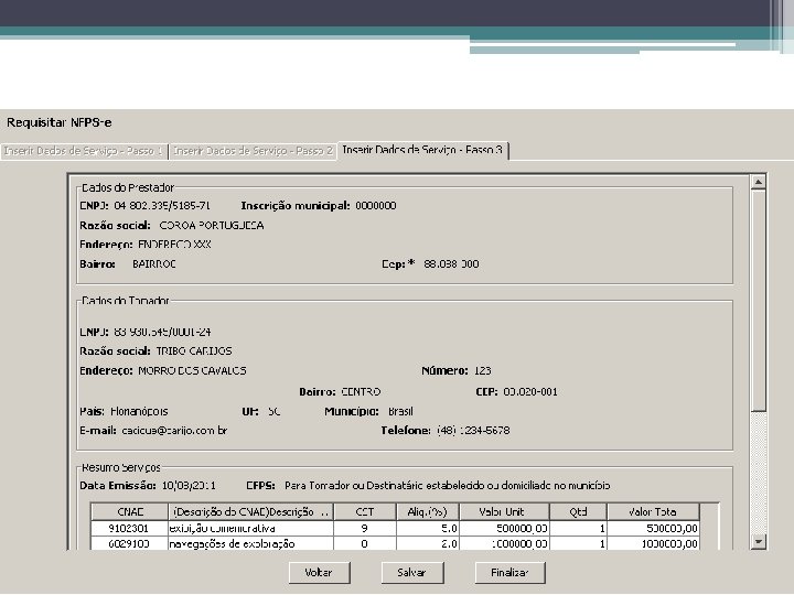 Utilização do Cliente NFPS-e Criação de Requisições de NFPS-e • Passo 1 ▫ Dados do Prestador (FIAC) ▫ Dados do Tomador (Cadastro local) ▫ Seleção do Código Fiscal de Prestação de Serviço (CFPS)