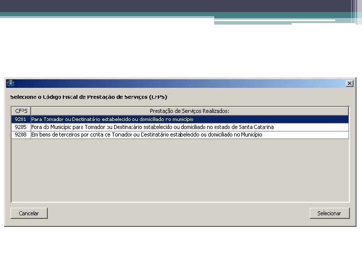 Filtro CFPS • Localidade do Tomador ▫ Do Município �CFPS: 9201, 9205 e 9208 ▫ De Outro Município de SC �CFPS: 9202, 9205 e 9209 ▫ De Outro Estado Brasileiro �CFPS: 9203, 9206 e 9210 ▫ Do Exterior �CFPS: 9204, 9207 e 9211
