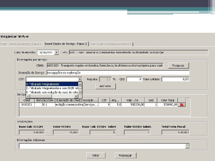 Utilização do Cliente NFPS-e Criação de Requisições de NFPS-e • Passo 2 ▫ Data de emissão ▫ Dados do Serviços �CNAE, descrição do serviço, CST*, alíquota*, quantidade e valor unitário ▫ Dados adicionais