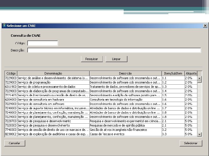 Códigos Tributários • Download dos Códigos ▫ URL base �http: //adm 2. pmf. sc. gov. br/sefinnet/lista_csv. dados. php ▫ Parâmetros �doc = identificador da tabela �tipo = (0 – hash MD 5 ou 1 – conteúdo) • Tabela CNAE ▫ ? doc=cnae&tipo=0 • Tabela CFPS ▫ ? doc=cfps&tipo=0 • Tabela CST ▫ ? doc=cst&tipo=0