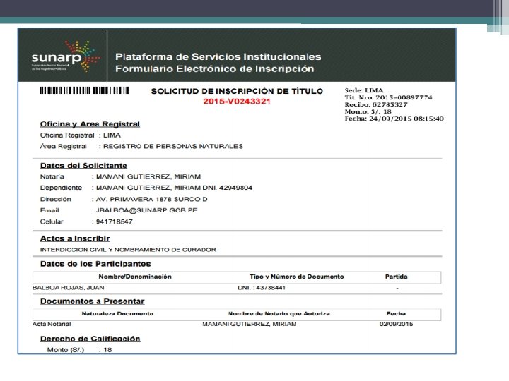 • La bandeja de entrada de solicitudes permite recibir y visualizar las solicitudes de los ciudadanos de acuerdo al acto materia de formalización, así como generar el proyecto de parte notarial en formato PDF para ser enviado a la bandeja de solicitudes para firmar. Para tales efectos, el notario deberá: • (i) Asignar el número de kardex, • (ii) Determinar los derechos registrales por el acto materia de formalización, pudiendo acceder a la calculadora registral, • (iii)Formular observaciones a los datos consignados por el ciudadano, cuando corresponda, • (iv) Ingresar la introducción, conclusión e insertos de ley.