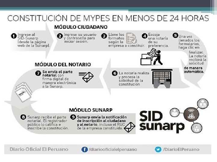 La Superintendencia Nacional de los Registros Públicos - SUNARP implementó una plataforma de servicios denominada “Sistema de Intermediación Digital” (SID-SUNARP) para generar el parte notarial de firma electrónica a fin de ser firmado digitalmente por el notario, así como la constancia de anotación y asiento de inscripción con firma digital del registrador.