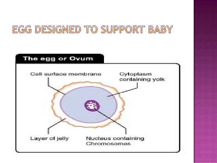 Mitochondria = energy for travel Flagella = movement Acrosome= enzymes to digest egg’s protective coating Nucleus= contains chromosomes SPERM CELLS = motile nucleus