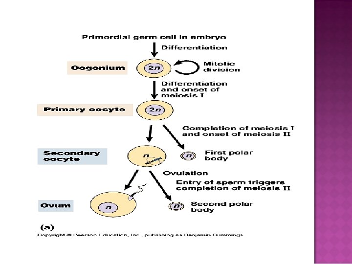 Females are born with set amount of oogonia 1) At birth, primary oocytes halted at prophase I 2) Hormones trigger ONE primary oocyte per month to finish meiosis I (after puberty) 3) secondary oocytes halted at metaphase II of meiosis 4) entry of sperm triggers completion of meiosis II 5) ovum is formed as product of meiosis II