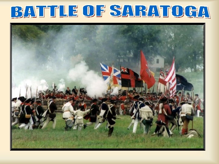 General Horatio Gates surrounds the British with the help of Benedict Arnold British defeat stopped them from cutting off New England from the rest of the country and ending the war. British lacked knowledge of geography and failed at communications. Oct. 1777, British General, John Burgoyne was surrounded by US General Horatio Gates and forced to surrender 6, 000 British troops. Led to a military alliance with France providing soldiers, naval fleet and $$$$$. (Franco-American alliance, 1778)