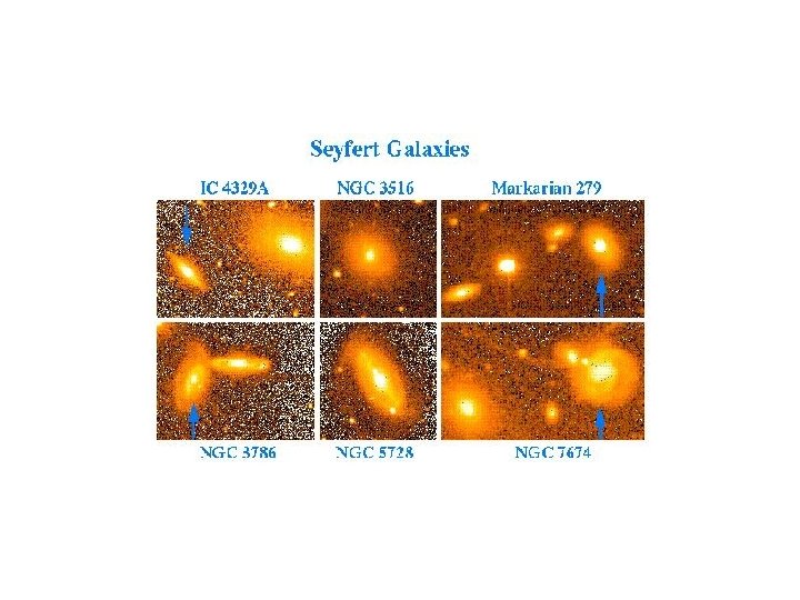 ACTIVE GALAXIES: On average, seen at closer distances than QSOs. Some in nearby clusters. Seyfert Galaxies: ~1037 watts, 1, 000 x dimmer than QSOs. Type I--broad (narrow peak) and narrow emission lines. Type II--just narrow emission lines. ). Radio Galaxies: Less luminous than Quasars. Often elliptical or peculiar (collision-stimulated? ).